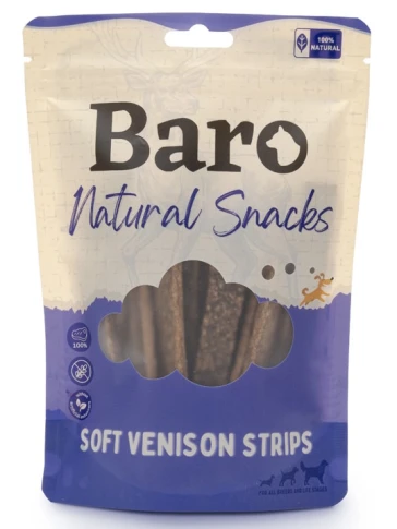Divljač je izvrstan izvor proteina, vitamina i minerala. Sadrži vitamin B i omega-3 masne kiseline, koje su korisne za zdravlje mozga te zdravu kožu i dlaku. Baro Soft Venison Strips savršena su zdrava hipoalergena poslastica jer su vrlo pogodne za alergične i osjetljive pse. Mnogi psi uživaju u okusu divljači, jer meso divljači ima vrlo bogat i primamljiv okus. Kvaliteta mesa koje koristimo u našim poslasticama je na razini ljudske kvalitete, što znači da poslastice ne sadrže životinjske i biljne nusproizvode.