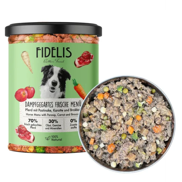 Za naš svježi jelovnik s konjima koristimo samo svježe, prehrambene sastojke u našem vlastitom proizvodnom pogonu. Visokokvalitetno konjsko meso i iznutrice kuhaju se polako i lagano na niskim temperaturama. Tek tada u kuhanu hranu dodajemo blanširani pastrnjak, mrkvu, grašak, brokulu i jabuke, te laneno ulje, šipak, algu limetu, pivski kvasac, brašno od algi i ružmarin. Time se osigurava optimalno očuvanje okusa i hranjivih tvari.