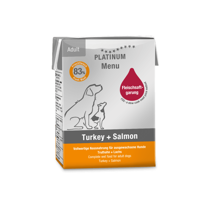 Platinum Menu Puretina i Losos je potpuna mokra hrana za odrasle pse svih pasmina. Zbog prirodnih sastojaka i zdravog sastava vrlo je lagana za probavu tvog ljubimca. Platinum hrana napravljena je bez dodataka, umjetnih okusa, boja i mirisa ili pojačivača okusa.