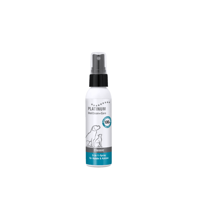 Platinum Oral Clean + Care Classic Spray 65 ml – 3 U 1 je sprej za njegu zubiju pasa i mačaka. Pomaže uklanjanju zubnog kamenaca, ublažava upalu desni, protiv lošeg zadaha.