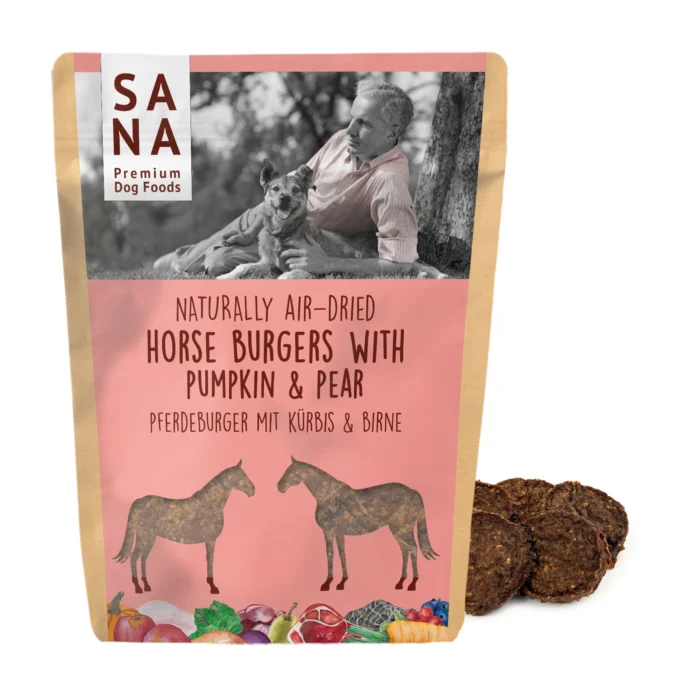SANADOG konjski burgeri s bundevom i kruškom poslastica su za vašeg psa napravljeni od čistog, visokokvalitetnog konjskog mesa i zdrave superhrane.
